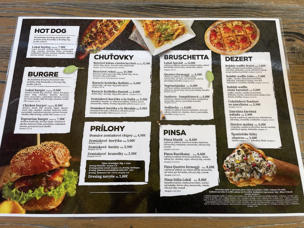 Food offerings are divided into categories such as burgers, light snacks, and shareable dishes. Highlights include several types of burgers like the Super Burger and Lokal Burger, as well as lighter fare such as bruschettas—both the Bruschetta Lokal Špecial and Bruschetta Šunkovo Syrová. Additional options include spicy and non-spicy chicken wings (Kridielka Pikantné and Buffalo Kridelka), hot dogs, and various side dishes including sweet potato fries (Batatove Hranolčeky) and potato coins (Zemiakové Dukáty).